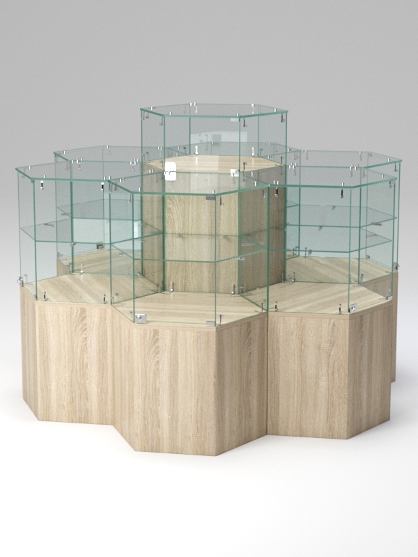 Прилавки данной серии выполнены в форме шестигранника, чем, несомненно, привлекают внимание. Контрастные по цвету панели из ЛДСП, кристально прозрачные витрины, блестящая фурнитура — все это выглядит элегантно и стильно. Прилавки могут сочетаться в любых комбинациях и в любом количестве. Нагрузка на стеклянные полки — 5-7кг при равномерном распределении предметов.