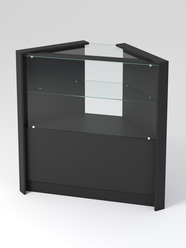 Прилавок имеет трапецевидную форму. Верхняя половина, крышка и полка выполнены из стекла, нижняя половина — из ЛДСП.