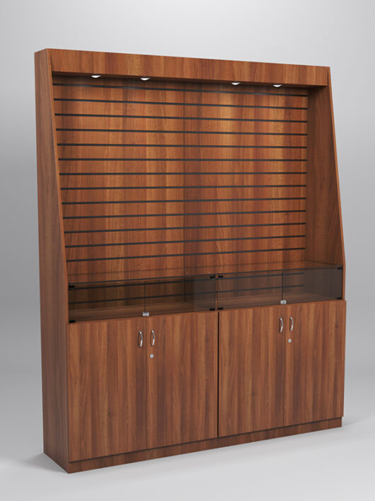 Витрины и накопители оборудованы дверками с замком. Каркас выполнен из ЛДСП толщиной 16мм. Цвет подбирается в вариантах стандарт и на заказ. В верхней части предусмотрена подсветка. В стоимость не входят пластиковые вставки.
