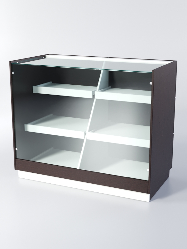 Прилавок имеет два отделения, с двумя полками в каждом. Передняя панель и крыша стеклянные. Полки изготовлены из ЛДСП.