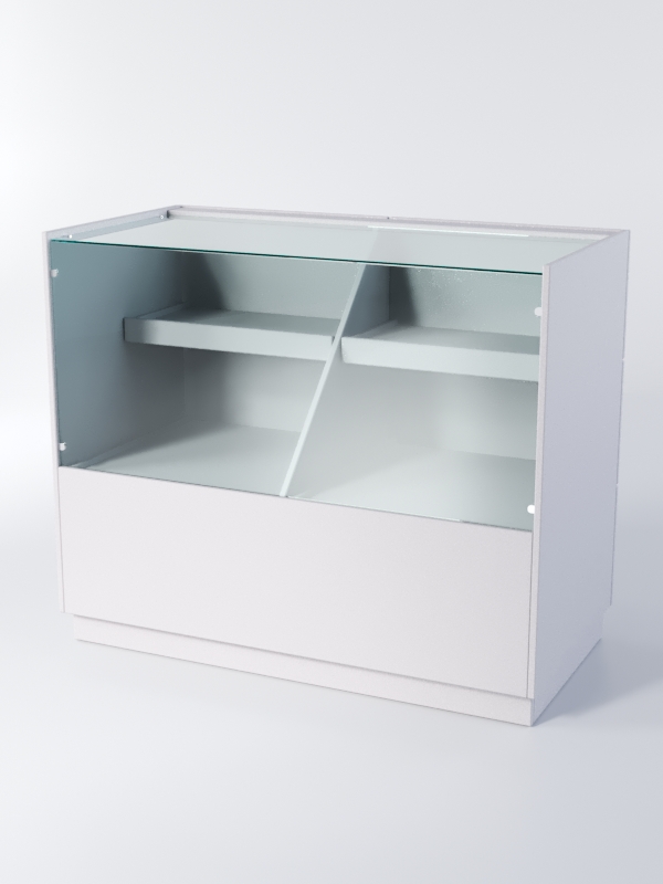 Прилавок имеет два отделения с полками из ЛДСП. Передняя панель и крыша стеклянные.