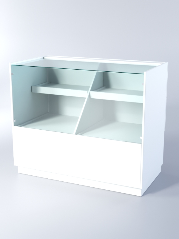 Прилавок имеет два отделения, с полками из ЛДСП. Передняя панель и крыша стеклянные. С внутренней стороны, под полками, находится ниша для хранения.