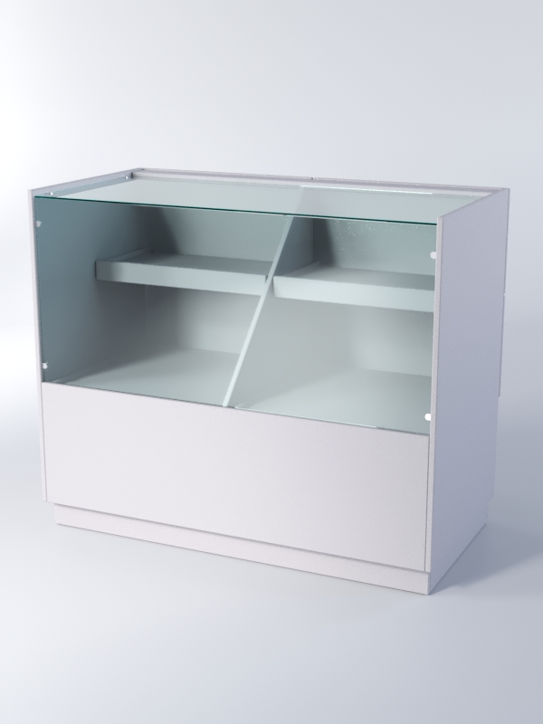 Прилавок имеет два отделения, с полками из ЛДСП. Передняя панель и крыша стеклянные. С внутренней стороны, под полками, находится ниша для хранения.