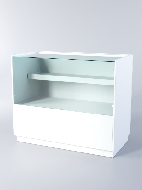 Прилавок оборудован полкой из ЛДСП. Передняя панель и крыша стеклянные. С внутренней стороны располагается ящик для хранения.