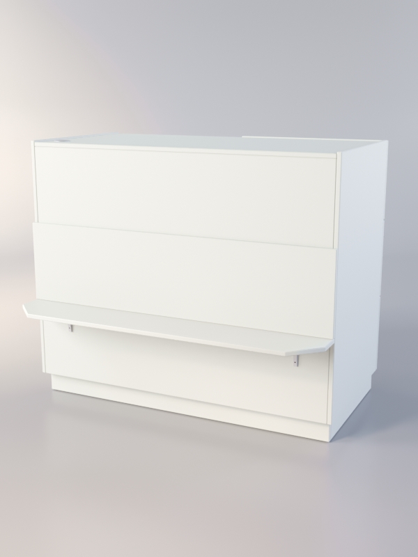Закрытый прилавок. Передняя панель оборудована полкой для сумок. Внутренняя сторона состоит из двух отделений. В одном отделении находится три выдвижных ящика, в другом — полка.