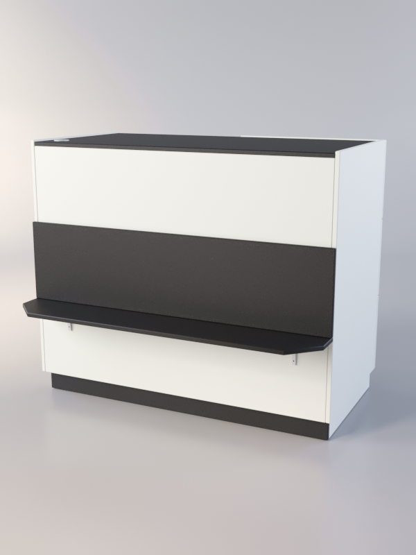 Закрытый прилавок. Передняя панель оборудована полкой для сумок. Внутренняя сторона состоит из двух отделений. В одном отделении находится три выдвижных ящика, в другом — полка.