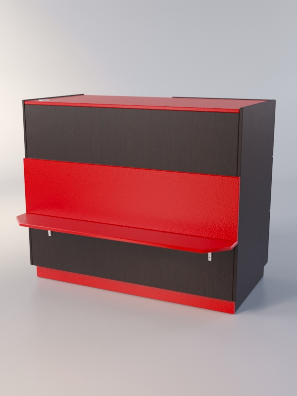 Закрытый прилавок. Передняя панель оборудована полкой для сумок. Внутренняя сторона состоит из двух отделений. В одном отделении находится три выдвижных ящика, в другом — полка.
