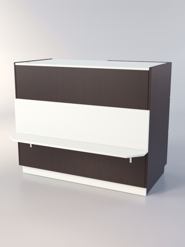 Закрытый прилавок. Передняя панель оборудована полкой для сумок. Внутренняя сторона состоит из двух отделений. В одном отделении находится три выдвижных ящика, в другом — полка.