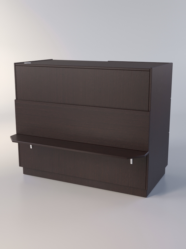 Закрытый прилавок. Передняя панель оборудована полкой для сумок. Внутренняя сторона состоит из двух отделений. В одном отделении находится три выдвижных ящика, в другом — полка.