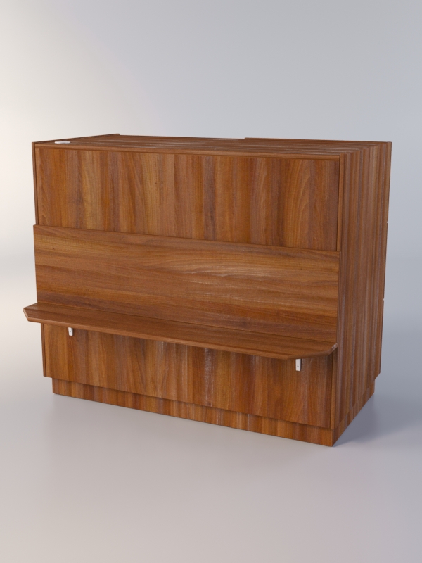 Закрытый прилавок. Передняя панель оборудована полкой для сумок. Внутренняя сторона состоит из двух отделений. В одном отделении находится три выдвижных ящика, в другом — полка.