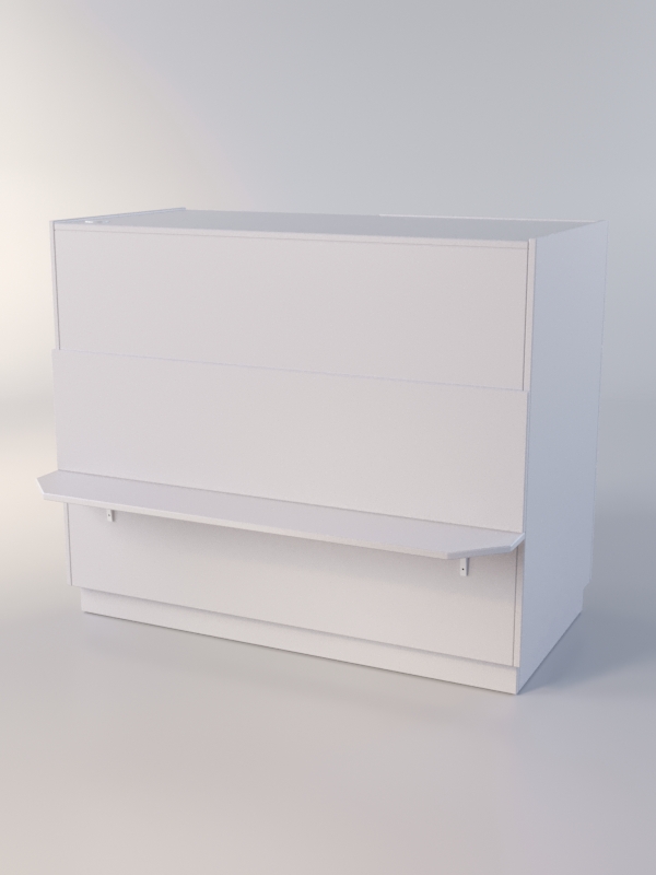 Закрытый прилавок. Передняя панель оборудована полкой для сумок. Внутренняя сторона состоит из двух отделений. В одном отделении находится три выдвижных ящика, в другом — полка.