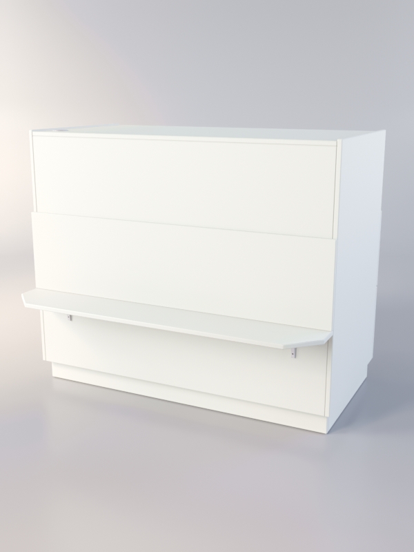 Закрытый прилавок. Передняя панель оборудована полкой для сумок. Внутренняя сторона имеет два отделения. В одном отделении находится полка и два ящика, в другом — полка.
