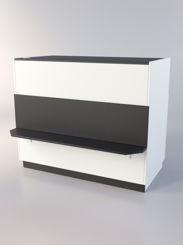Закрытый прилавок. Передняя панель оборудована полкой для сумок. Внутренняя сторона имеет два отделения. В одном отделении находится полка и два ящика, в другом — полка.