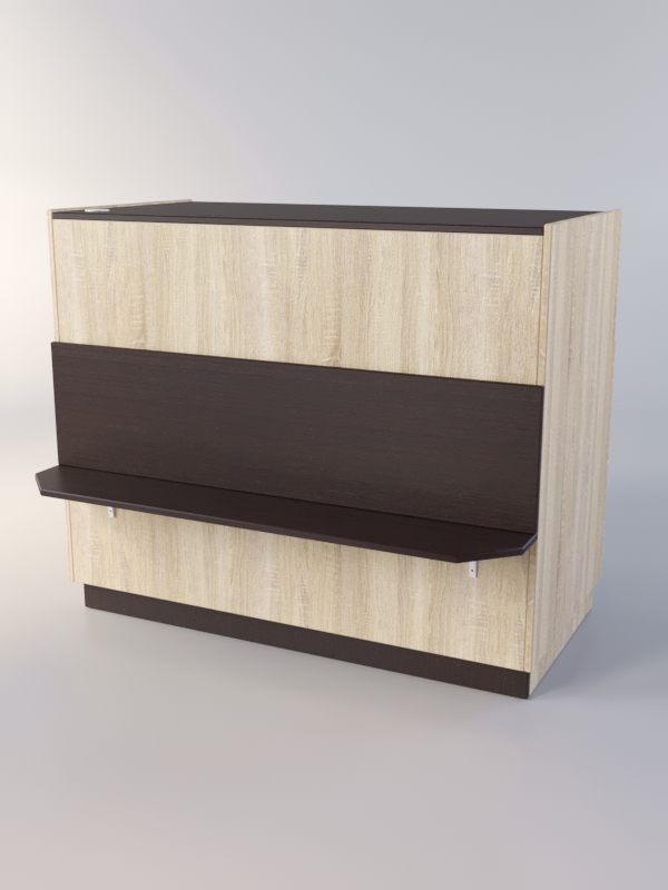 Закрытый прилавок. Передняя панель оборудована полкой для сумок. Внутренняя сторона имеет два отделения. В одном отделении находится полка и два ящика, в другом — полка.