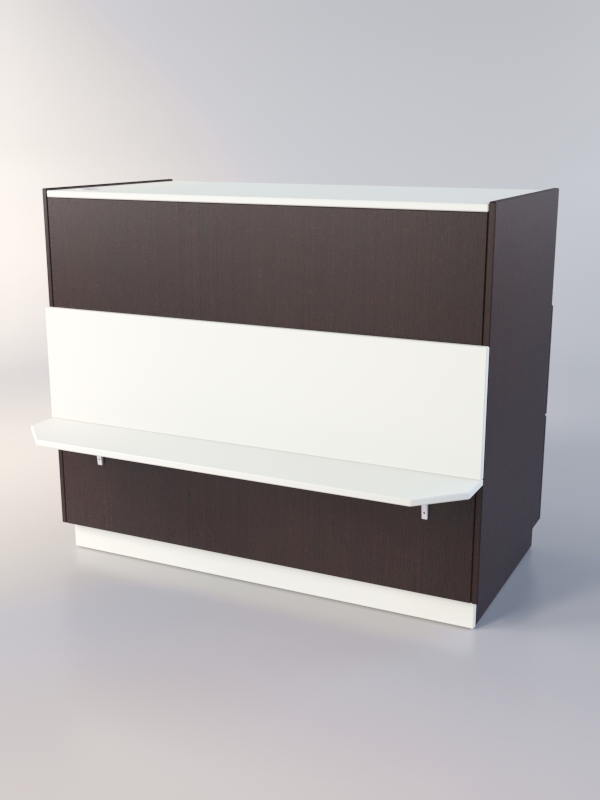 Закрытый прилавок. Передняя панель оборудована полкой для сумок. Внутренняя сторона имеет два отделения. В одном отделении находится полка и два ящика, в другом — полка.