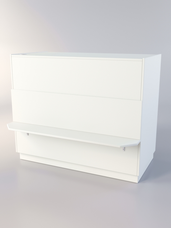 Закрытый прилавок. Передняя панель оборудована полкой для сумок. Внутреннее пространство прилавка посредством перегородки и полки разделено на 4 секции.