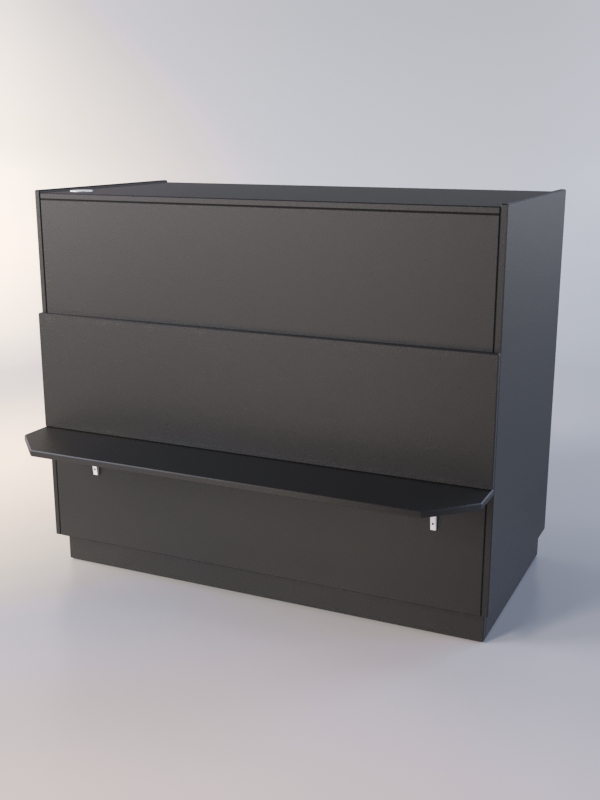 Закрытый прилавок. Передняя панель оборудована полкой для сумок. Внутреннее пространство прилавка посредством перегородки и полки разделено на 4 секции.