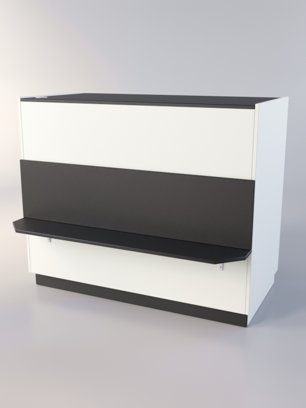 Закрытый прилавок. Передняя панель оборудована полкой для сумок. Внутреннее пространство прилавка посредством перегородки и полки разделено на 4 секции.