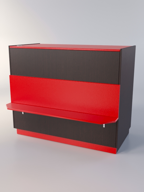 Закрытый прилавок. Передняя панель оборудована полкой для сумок. Внутреннее пространство прилавка посредством перегородки и полки разделено на 4 секции.