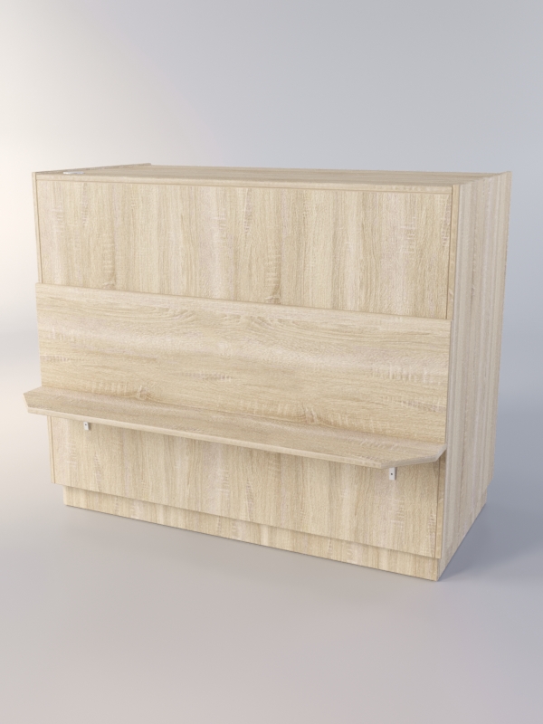 Закрытый прилавок. Передняя панель оборудована полкой для сумок. Внутреннее пространство прилавка посредством перегородки и полки разделено на 4 секции.