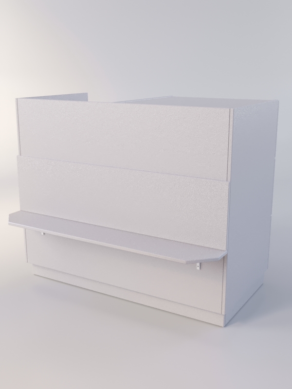 Передняя панель оборудована полкой-держателем для сумок. С внутренней стороны прилавок состоит из двух отделений. В одном отделении располагаются три ящика. Другое отделение имеет открытую верхнюю часть и полку.
