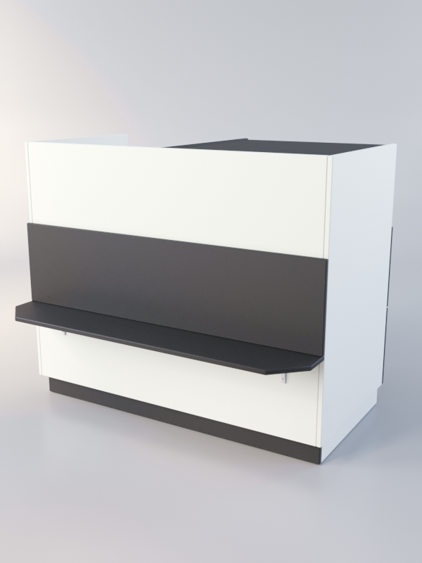 Передняя панель оборудована полкой-держателем для сумок. С внутренней стороны прилавок состоит из двух отделений. В одном отделении располагаются полка и два ящика. Другое отделение имеет открытую верхнюю часть и полку.