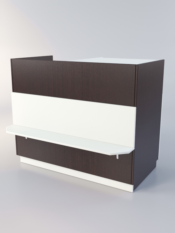 Передняя панель оборудована полкой-держателем для сумок. С внутренней стороны прилавок состоит из двух отделений. В одном отделении располагаются полка и два ящика. Другое отделение имеет открытую верхнюю часть и полку.