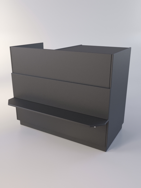 Передняя панель оборудована полкой-держателем для сумок. Внутреннее пространство прилавка состоит из двух отделений, с полкой в каждом. Одно из отделений имеет открытую верхнюю часть.