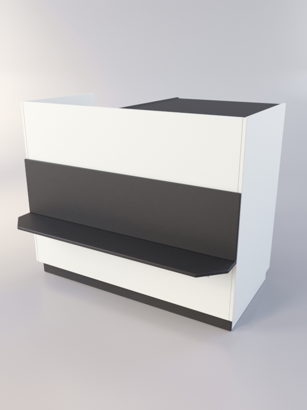 Передняя панель оборудована полкой-держателем для сумок. Внутреннее пространство прилавка состоит из двух отделений, с полкой в каждом. Одно из отделений имеет открытую верхнюю часть.