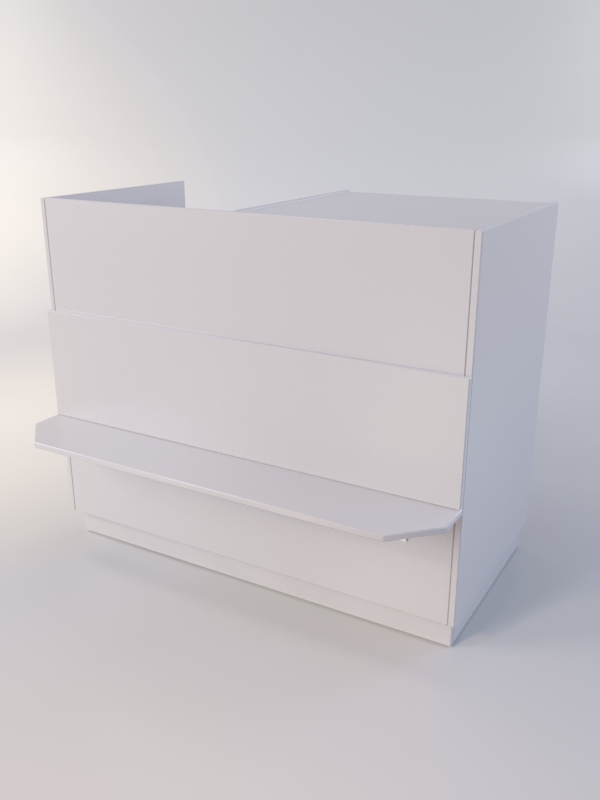 Передняя панель оборудована полкой-держателем для сумок. Внутреннее пространство прилавка состоит из двух отделений, с полкой в каждом. Одно из отделений имеет открытую верхнюю часть.