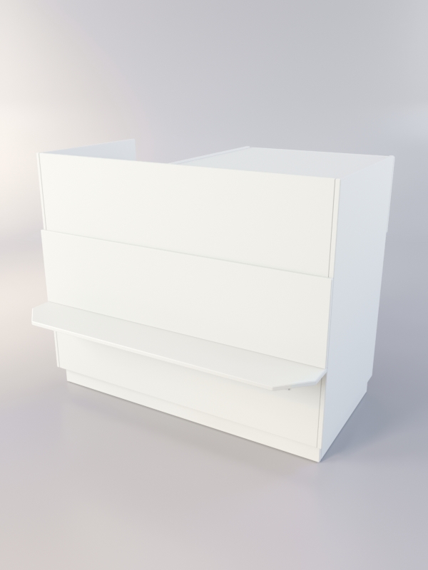 Передняя панель оборудована полкой-держателем для сумок. Внутреннее пространство прилавка состоит из двух отделений. В одном отделении находится выдвижной ящик. Другое отделение — без крышки, внутри находится полка.