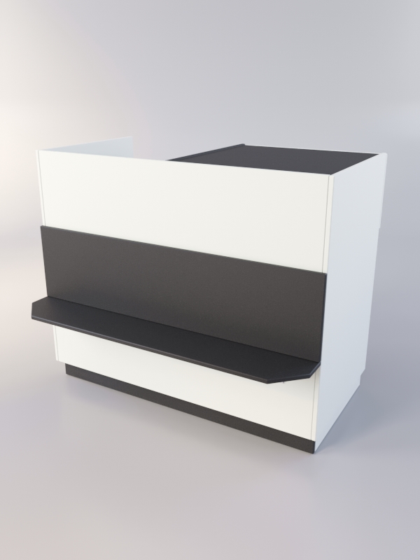 Передняя панель оборудована полкой-держателем для сумок. Внутреннее пространство прилавка состоит из двух отделений. В одном отделении находится выдвижной ящик. Другое отделение — без крышки, внутри находится полка.