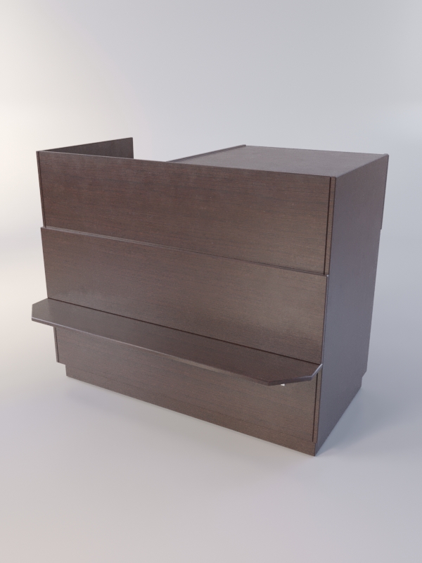 Передняя панель оборудована полкой-держателем для сумок. Внутреннее пространство прилавка состоит из двух отделений. В одном отделении находится выдвижной ящик. Другое отделение — без крышки, внутри находится полка.