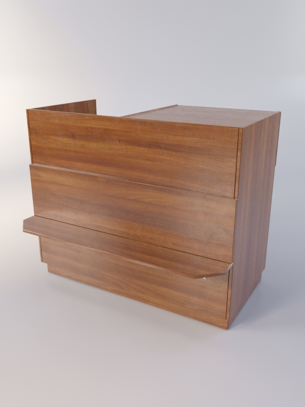 Передняя панель оборудована полкой-держателем для сумок. Внутреннее пространство прилавка состоит из двух отделений. В одном отделении находится выдвижной ящик. Другое отделение — без крышки, внутри находится полка.