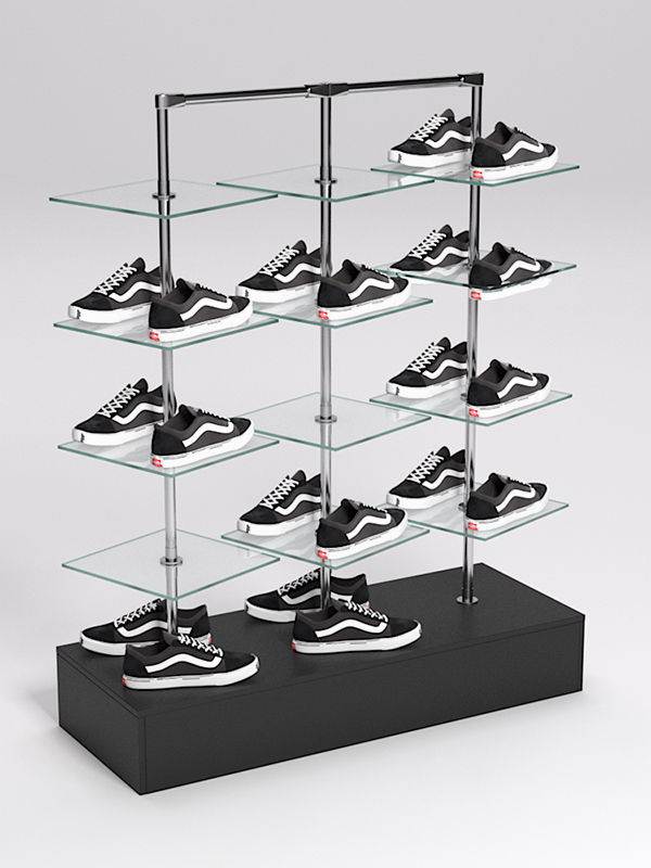 Оборудование для демонстрации обуви должно быть достаточно прочным и устойчивым. Учитывая эти требования, мы производим наши стойки из материалов, обладающих соответствующими характеристиками. В основании стойки находится подставка из ДСП — прочного, износостойкого материала, идеально вписывающегося в любой интерьер. Каркас выполнен из джокерной трубы, также отличающейся прочностью и эстетикой. К трубе крепятся стеклянные полки для размещения обуви.