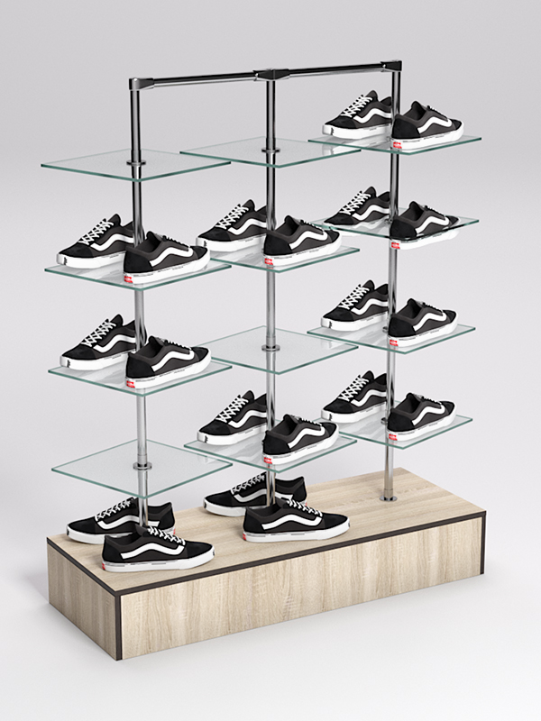 Оборудование для демонстрации обуви должно быть достаточно прочным и устойчивым. Учитывая эти требования, мы производим наши стойки из материалов, обладающих соответствующими характеристиками. В основании стойки находится подставка из ДСП — прочного, износостойкого материала, идеально вписывающегося в любой интерьер. Каркас выполнен из джокерной трубы, также отличающейся прочностью и эстетикой. К трубе крепятся стеклянные полки для размещения обуви.