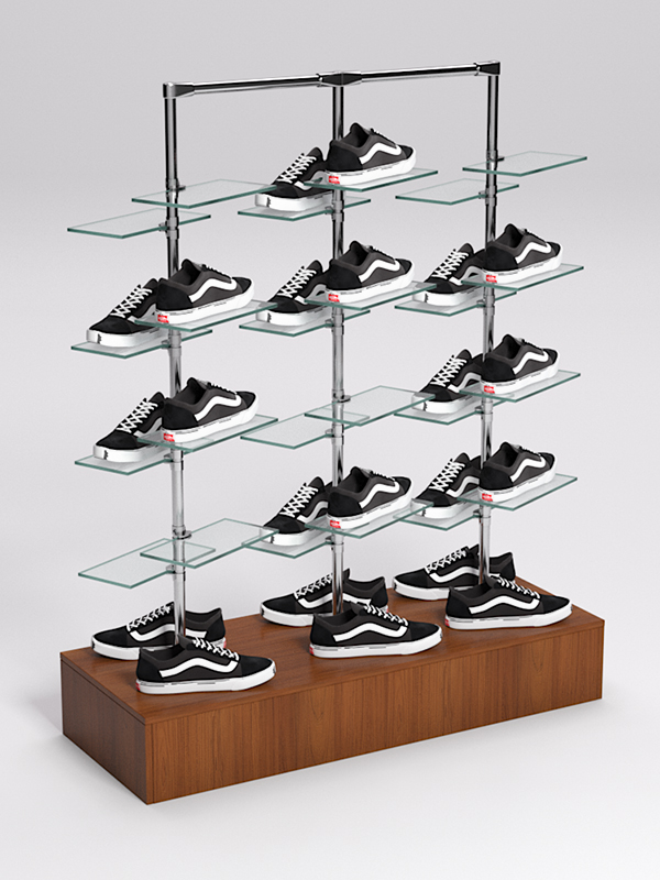 Оборудование для демонстрации обуви должно быть достаточно прочным и устойчивым. Учитывая эти требования, мы производим наши стойки из материалов, обладающих соответствующими характеристиками. В основании стойки находится подставка из ДСП — прочного, износостойкого материала, идеально вписывающегося в любой интерьер. Каркас выполнен из джокерной трубы, также отличающейся прочностью и эстетикой. К трубе крепятся стеклянные полки для размещения обуви.