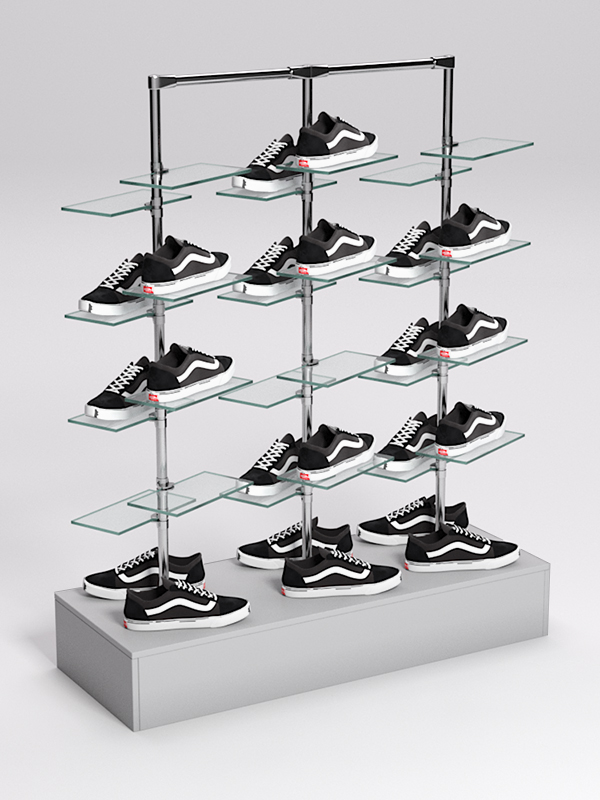Оборудование для демонстрации обуви должно быть достаточно прочным и устойчивым. Учитывая эти требования, мы производим наши стойки из материалов, обладающих соответствующими характеристиками. В основании стойки находится подставка из ДСП — прочного, износостойкого материала, идеально вписывающегося в любой интерьер. Каркас выполнен из джокерной трубы, также отличающейся прочностью и эстетикой. К трубе крепятся стеклянные полки для размещения обуви.