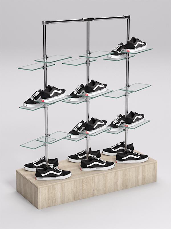 Оборудование для демонстрации обуви должно быть достаточно прочным и устойчивым. Учитывая эти требования, мы производим наши стойки из материалов, обладающих соответствующими характеристиками. В основании стойки находится подставка из ДСП — прочного, износостойкого материала, идеально вписывающегося в любой интерьер. Каркас выполнен из джокерной трубы, также отличающейся прочностью и эстетикой. К трубе крепятся стеклянные полки для размещения обуви.