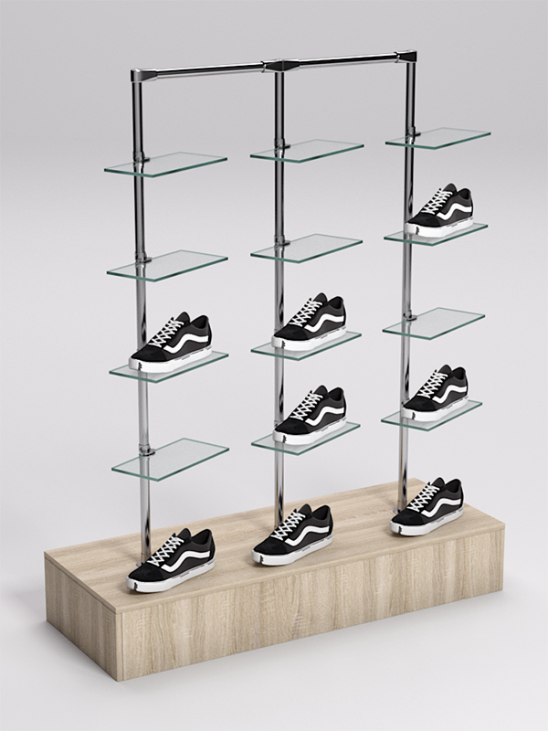 Оборудование для демонстрации обуви должно быть достаточно прочным и устойчивым. Учитывая эти требования, мы производим наши стойки из материалов, обладающих соответствующими характеристиками. В основании стойки находится подставка из ДСП — прочного, износостойкого материала, идеально вписывающегося в любой интерьер. Каркас выполнен из джокерной трубы, также отличающейся прочностью и эстетикой. К трубе крепятся стеклянные полки для размещения обуви.