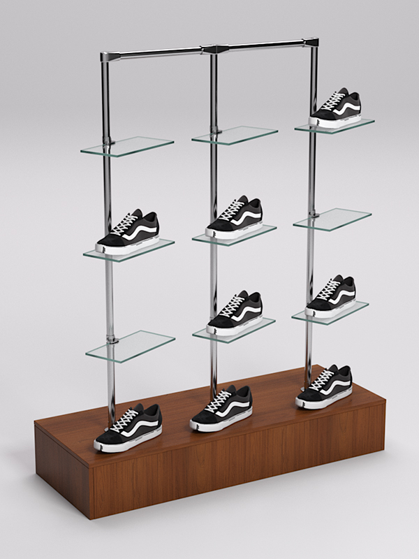 Оборудование для демонстрации обуви должно быть достаточно прочным и устойчивым. Учитывая эти требования, мы производим наши стойки из материалов, обладающих соответствующими характеристиками. В основании стойки находится подставка из ДСП — прочного, износостойкого материала, идеально вписывающегося в любой интерьер. Каркас выполнен из джокерной трубы, также отличающейся прочностью и эстетикой. К трубе крепятся стеклянные полки для размещения обуви.