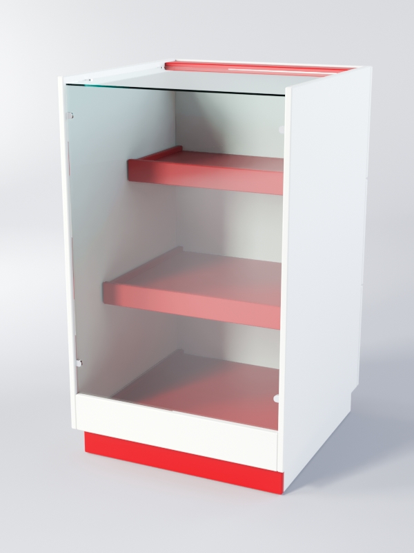 Прилавок имеет витрину с тремя полками, выдвигающимися со стороны продавца. Выдвижные панели оборудованы замком. Передняя панель и крыша — стеклянные. Полки изготовлены из ЛДСП. Каркас можно изготовить в другом цветовом сочетании, выбрав варианты, перечисленные на сайте.