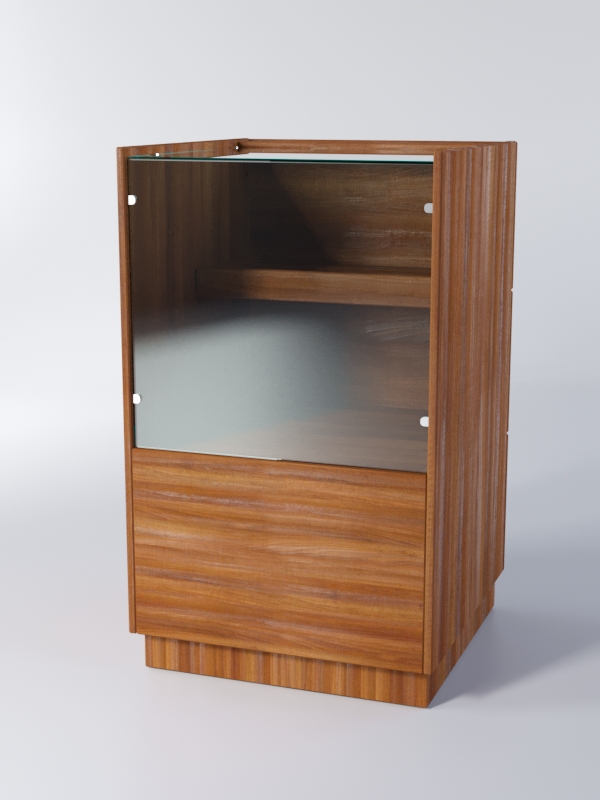 Конструкция состоит из витрины с двумя полками и накопителя, выдвигающимися со стороны продавца. Выдвижные панели оборудованы замком. Передняя панель и крыша витрины — стеклянные. Полки изготовлены из ЛДСП. Каркас можно изготовить в другом цветовом сочетании, выбрав варианты, перечисленные на сайте.