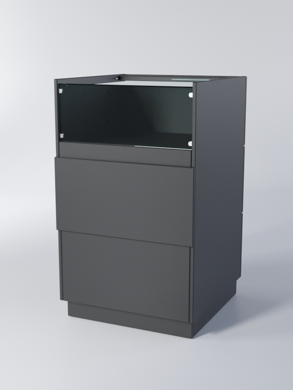 Конструкция состоит из витрины и двух накопителей. Все элементы выдвигаются со стороны продавца. Выдвижные панели оборудованы замком. Передняя панель и крыша витрины — стеклянные. Полки изготовлены из ЛДСП. Каркас можно изготовить в другом цветовом сочетании, выбрав варианты, перечисленные на сайте.