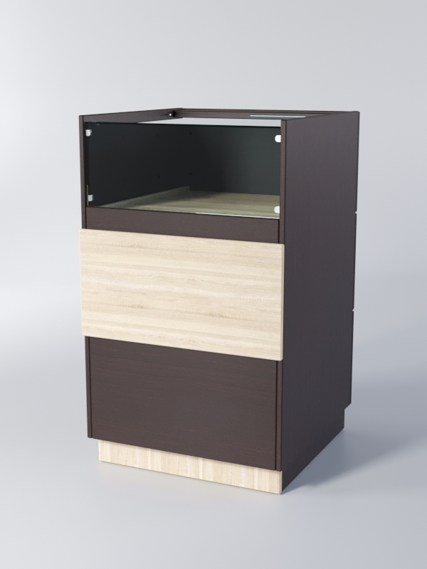Конструкция состоит из витрины и двух накопителей. Все элементы выдвигаются со стороны продавца. Выдвижные панели оборудованы замком. Передняя панель и крыша витрины — стеклянные. Полки изготовлены из ЛДСП. Каркас можно изготовить в другом цветовом сочетании, выбрав варианты, перечисленные на сайте.