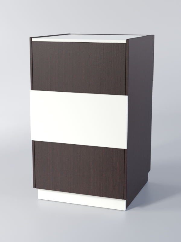 Прилавок полностью закрыт со стороны покупателя. С внутренней стороны имеет одно отделение и выдвижной накопитель, оборудованный замком. Каркас можно изготовить в другом цветовом сочетании, выбрав варианты, перечисленные на сайте.