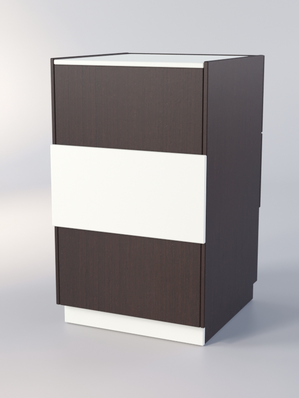 Прилавок полностью закрыт со стороны покупателя. С внутренней стороны имеет одно отделение и два выдвижных накопителя, оборудованных замком. Каркас можно изготовить в другом цветовом сочетании, выбрав варианты, перечисленные на сайте.