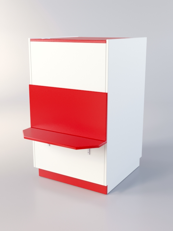 Прилавок полностью закрыт со стороны покупателя. На лицевой панели имеется полка для сумок. С внутренней стороны находится большое отделение с полкой. Каркас можно изготовить в другом цветовом сочетании, выбрав варианты, перечисленные на сайте.