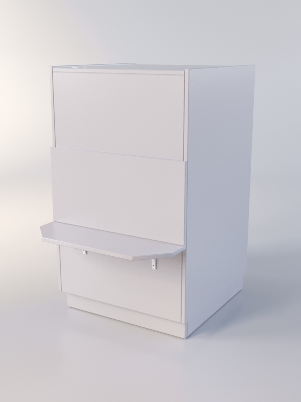 Прилавок полностью закрыт со стороны покупателя. На лицевой панели имеется полка для сумок. С внутренней стороны находится большое отделение с полкой. Каркас можно изготовить в другом цветовом сочетании, выбрав варианты, перечисленные на сайте.
