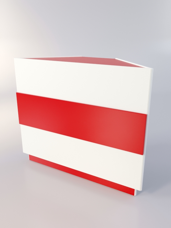 Модель имеет трапецевидную форму. Передняя панель, крыша и боковины выполнены из ЛДСП. Внутри прилавка имеется полка.